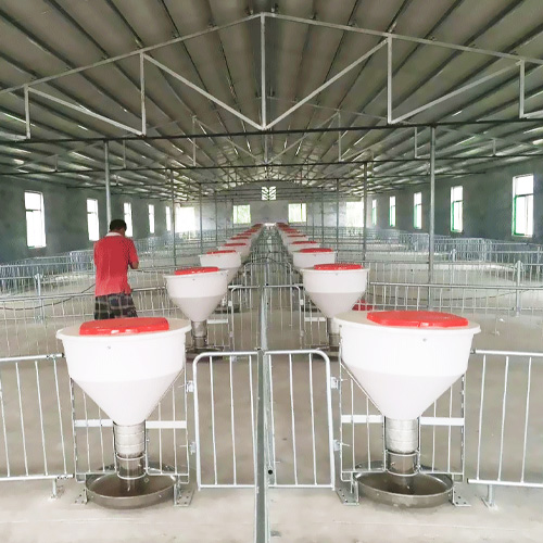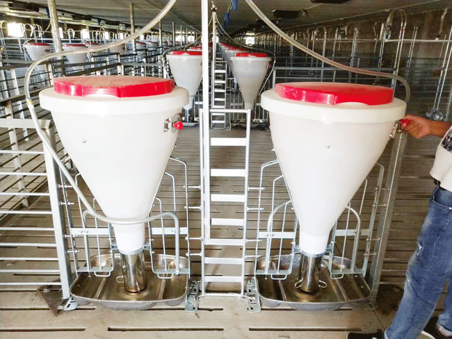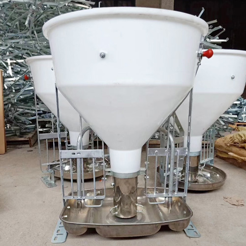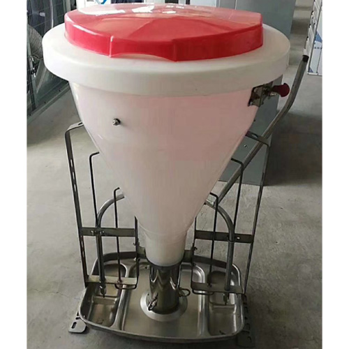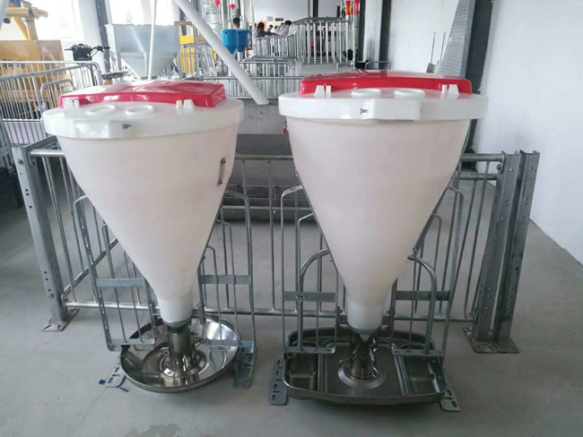 猪用干湿料槽是一种集合自动料槽和饮水功能为一体的养殖设备,也是技术产品,粉料和颗粒都能下料,通过设计巧妙的阀门模式均匀出料,以及自动调节功能,另外附加饮水设备,让猪只不必在食料和饮水来回跑动,利用饲料的消化吸收。通过实验证明,用干湿料槽做为饲喂工具的对照组和用水泥料槽做为饲喂工具的对照组,干湿料槽的有组生长速度明显增加。干湿料槽大大地减轻了饲养员劳动强度,避免浪费,降低成本,增加效益。